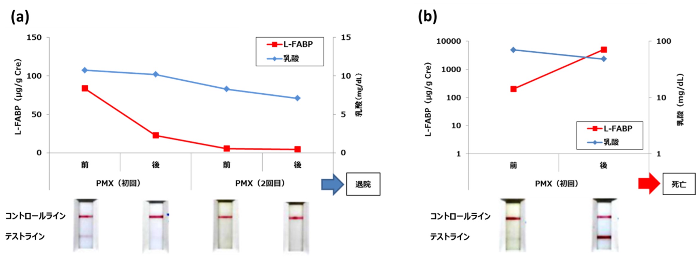 PMX療法により尿中L-FABP、乳酸が低下した敗血症患者の予後は良く後日退院(a)、PMX療法により尿中L-FABP、乳酸が低下しなかった敗血症患者は3日後に死亡した(b)。