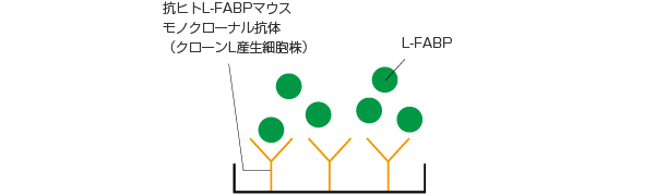 標準L-FABPまたは尿検体を前処理液で処理後、反応緩衝液を分注した抗L-FABP抗体固相化プレートに添加し反応させます。この時、反応液中のL-FABPは固相化抗体に結合します。