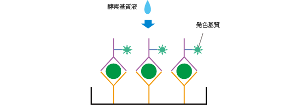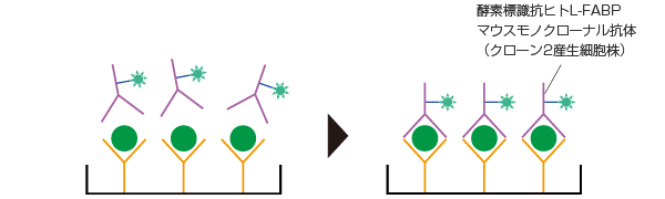 プレートを洗浄し、2次抗体として酵素標識抗体を添加し反応させることにより、L-FABPの量に応じた固相抗体一抗原一酵素標識抗体から成るサンドイッチ結合物を形成します。
