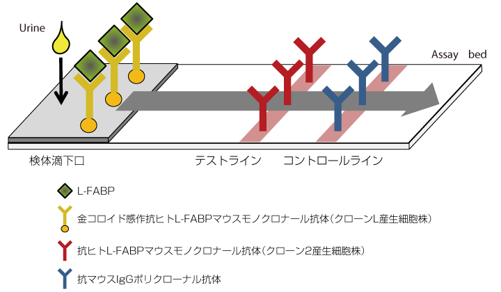 本品は、免疫イムノクロマト技術によるL-FABPの測定用試薬であり、本品に検体を添加して15分で尿中のL-FABP濃度を目視で測定する試薬です。検体をテストカセットの検体滴下口に添加すると、検体中のL-FABPは金コロイド感作抗ヒトL-FABPマウスモノクローナル抗体(クローンL産生細胞株)と反応し、免疫複合体を形成します。免疫複合体は毛細管現象によりメンブレン上を移動し、テストライン上に固定されている抗ヒトL-FABPマウスモノクローナル抗体(クローン2産生細胞株)と反応し、赤紫色のラインを形成します。