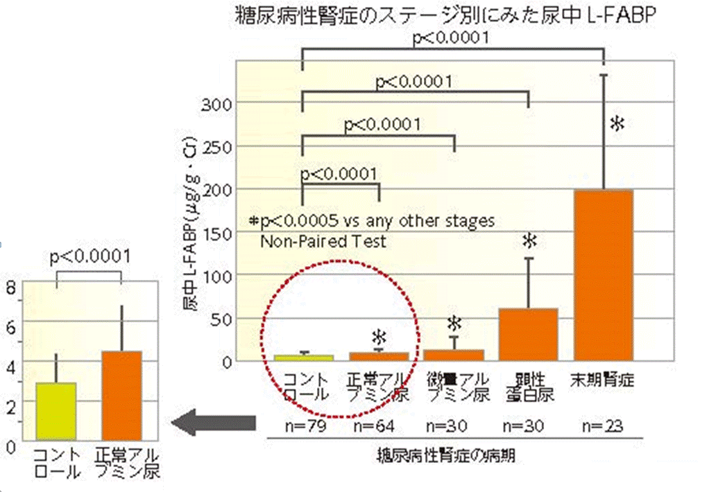 - 糖尿病性腎症患者の尿中L-FABPは病期の進行とともに増加し、健常人に比べて腎症早期より有意に高い値を示すことから、糖尿病性腎症の早期診断に有用である。